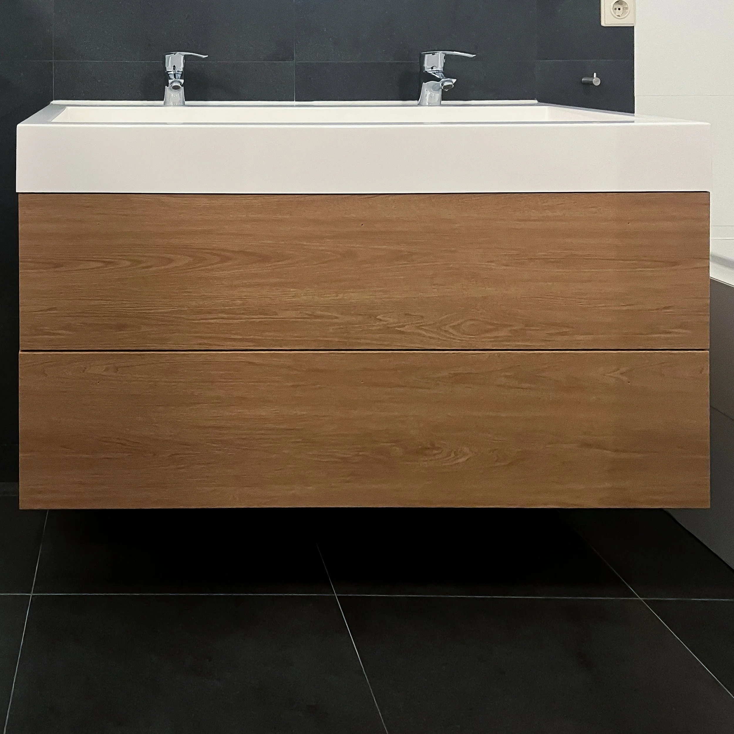 Wat eerst een standaard wit badkamermeubel was, is nu een warme blikvanger met een lichte houtlook. Met hoogwaardige interieurfolie hebben we het meubel volledig getransformeerd zonder hak- of breekwerk. De subtiele houtstructuur zorgt voor meer diepte en een natuurlijke uitstraling, terwijl de strakke afwerking behouden blijft. Een slimme upgrade die de badkamer direct meer sfeer geeft – snel gerealiseerd en aanzienlijk voordeliger dan vervangen.